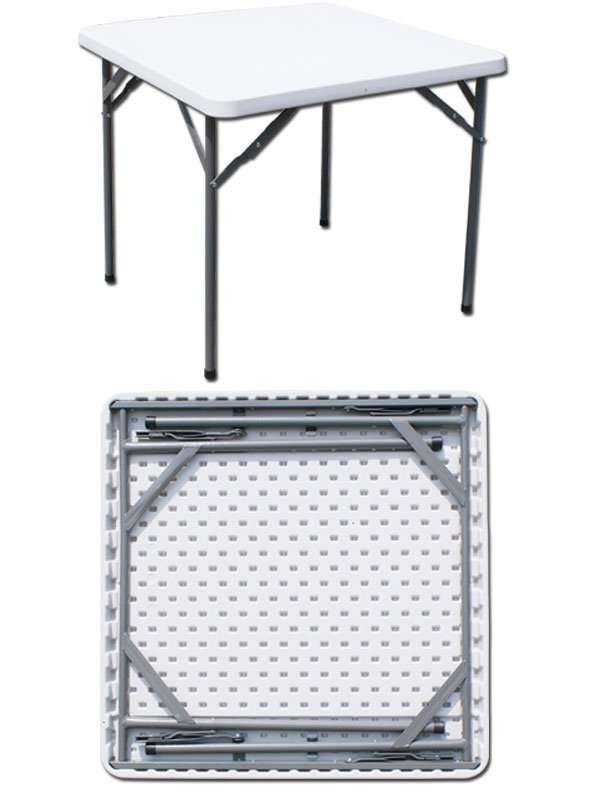 Struttura in acciaio verniciato, piano in HDPE (polietilene ad alta densità), pieghevole. Dimensioni cm 87x87x74h Peso 10 kg